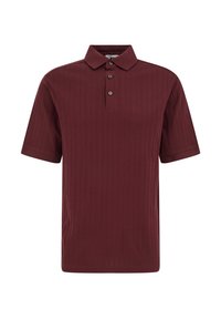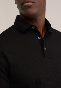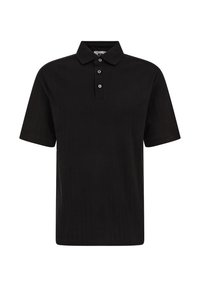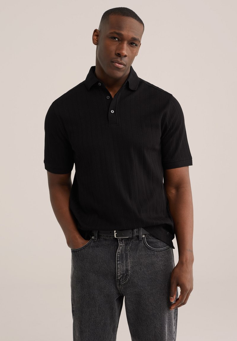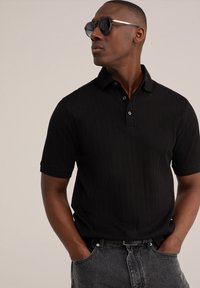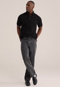 Jeune homme debout les mains dans les poches, portant un polo noir à manches courtes et un jean noir délavé, sur un fond uni.