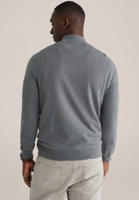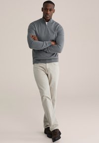 Pull gris à col zippé en maille douce, avec manches longues et poignets côtelés. Assorti à un jean clair pour un look décontracté.