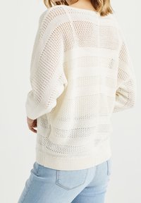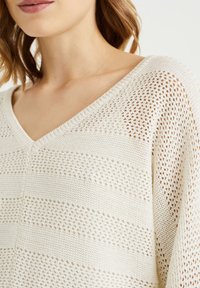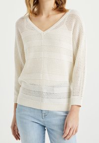 Femme portant un pull en maille crème à col en V ample avec un motif ajouré rayé et un jean bleu clair, sur un fond uni.