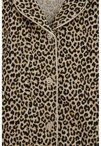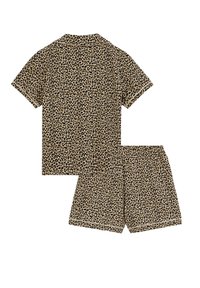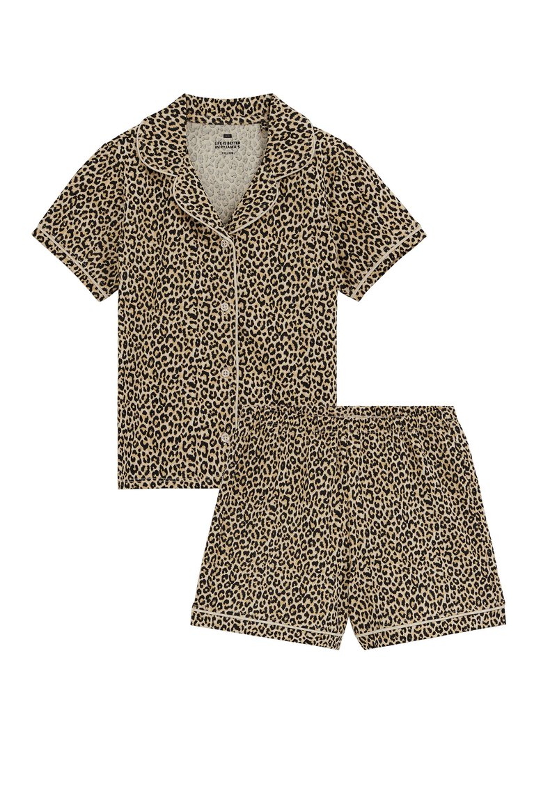 Ensemble pyjama composé d'un haut à manches courtes imprimé léopard avec boutons sur le devant, et d'un short assorti à taille élastique, agrémenté de petits passepoils clairs.