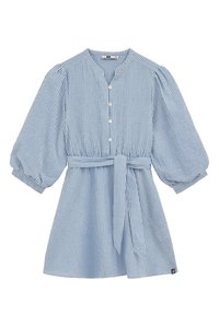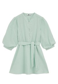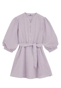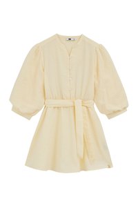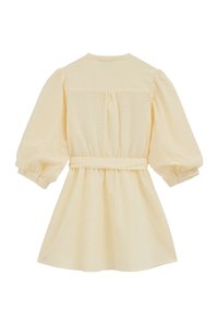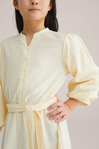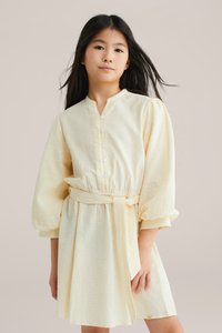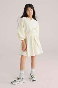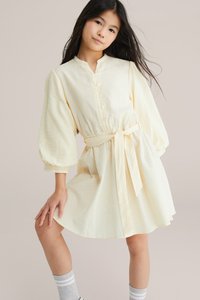 Jeune fille aux longs cheveux noirs portant une robe crème avec des boutons et une ceinture, des chaussettes grises et des baskets blanches, debout sur un fond uni.