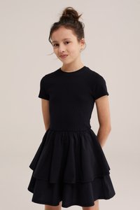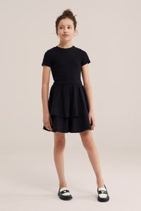 Fille debout, les mains le long du corps, portant une robe noire à manches courtes avec une jupe à volants et des mocassins Mickey Mouse noir et blanc.