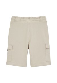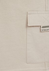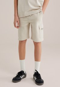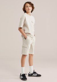 Jeune personne debout, mains dans les poches, portant un short beige, un t-shirt assorti, des chaussettes blanches et des baskets Adidas noires à bandes blanches.