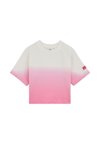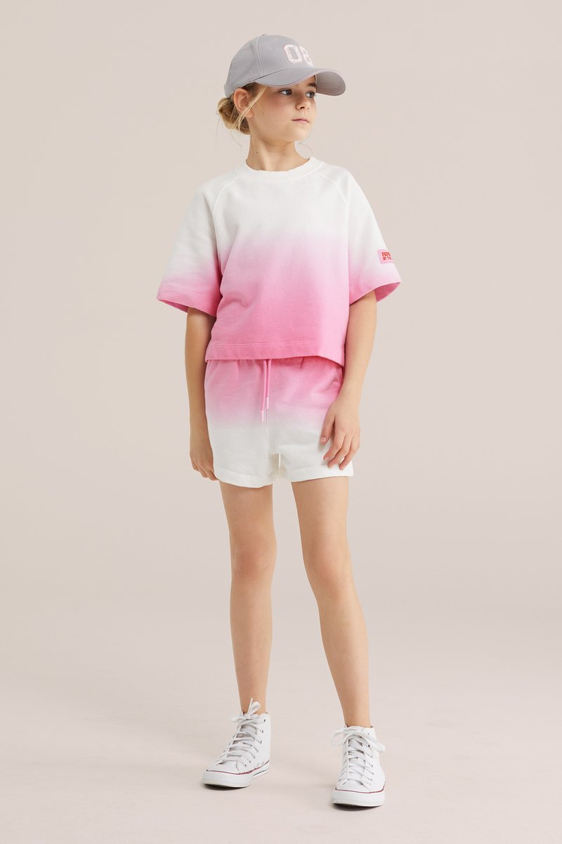 Fille portant une casquette grise, un t-shirt dégradé rose et blanc et un short assorti, ainsi que des baskets montantes blanches, debout devant un fond clair.