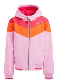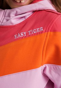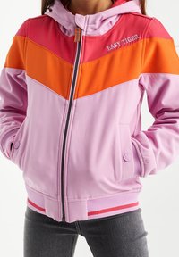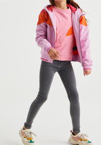 Veste zippée rose et orange avec capuche, assortie à un sweat-shirt rose, un jean skinny gris et des baskets multicolores.