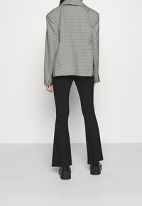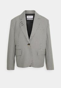 • Femme portant un blazer pied-de-poule beige et noir avec un bouton noir unique, par-dessus un haut noir et un pantalon noir, debout devant un fond uni.