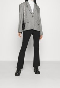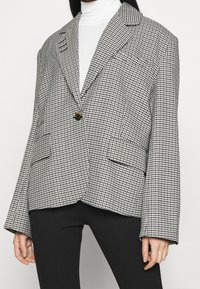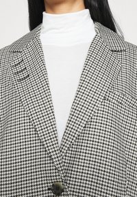 Femme portant un blazer pied-de-poule noir et blanc à un bouton, sur un col roulé blanc et un pantalon noir.