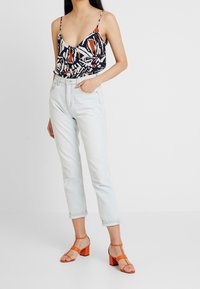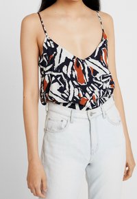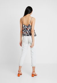 Femme portant un haut sans manches à motifs abstraits noirs, blancs et rouille avec de fines bretelles, rentré dans un jean taille haute délavé clair.