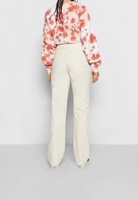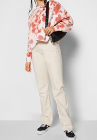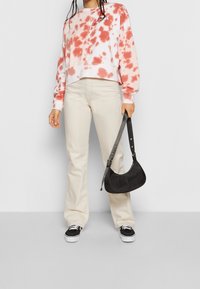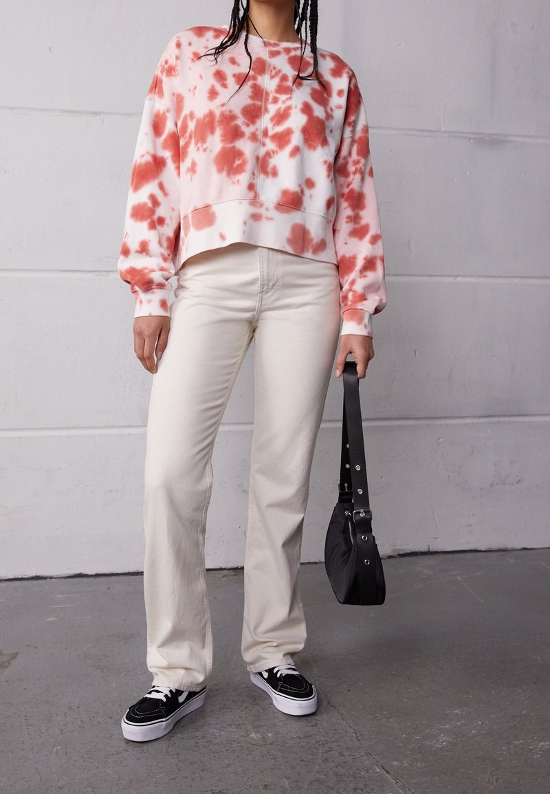 Sweatshirt en tie-dye rose et blanc, design court, associé à un jean couleur crème et des baskets noires. Le modèle tient un petit sac noir.