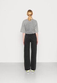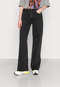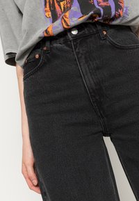 Jean noir taille haute à coupe droite, avec un style classique à cinq poches et une finition subtilement texturée. Porté avec des baskets blanches.