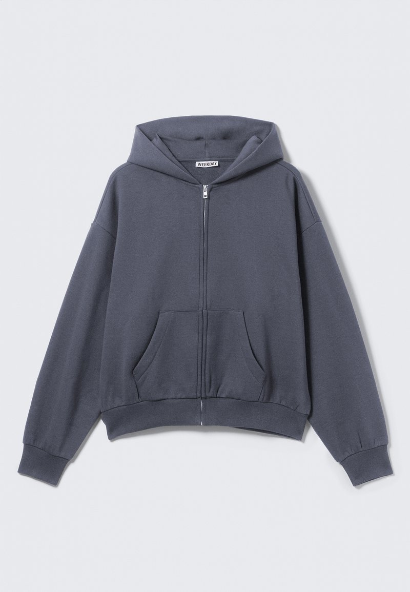 Sweatshirt zippé gris avec une grande capuche, poches frontales, poignets et ourlet côtelés. Tissu doux avec une texture lisse. Porté par-dessus une chemise blanche.