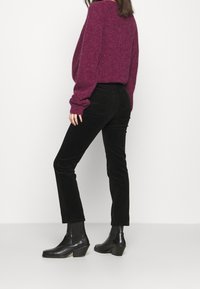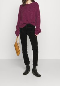 Pantalon en velours côtelé noir avec une coupe slim, taille haute et une texture douce, associé à un pull en maille bordeaux ample et des bottines noires.