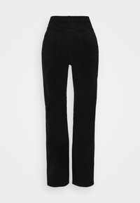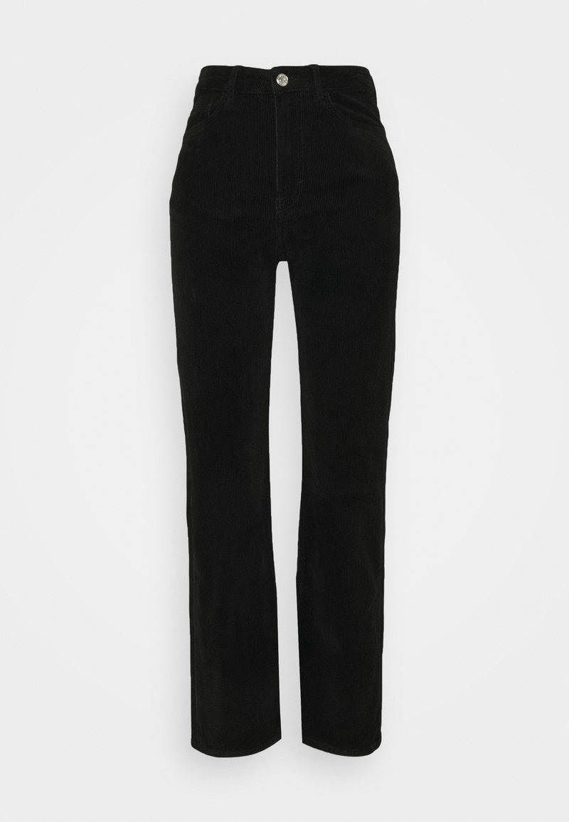 Pantalon en velours côtelé noir à taille haute, coupe droite, avec une fermeture à bouton sur le devant. Le tissu présente une texture côtelée sans motifs visibles.