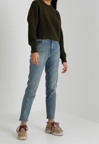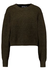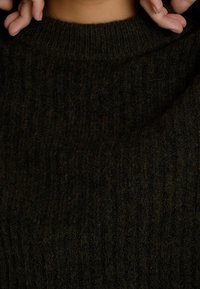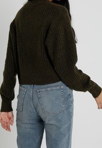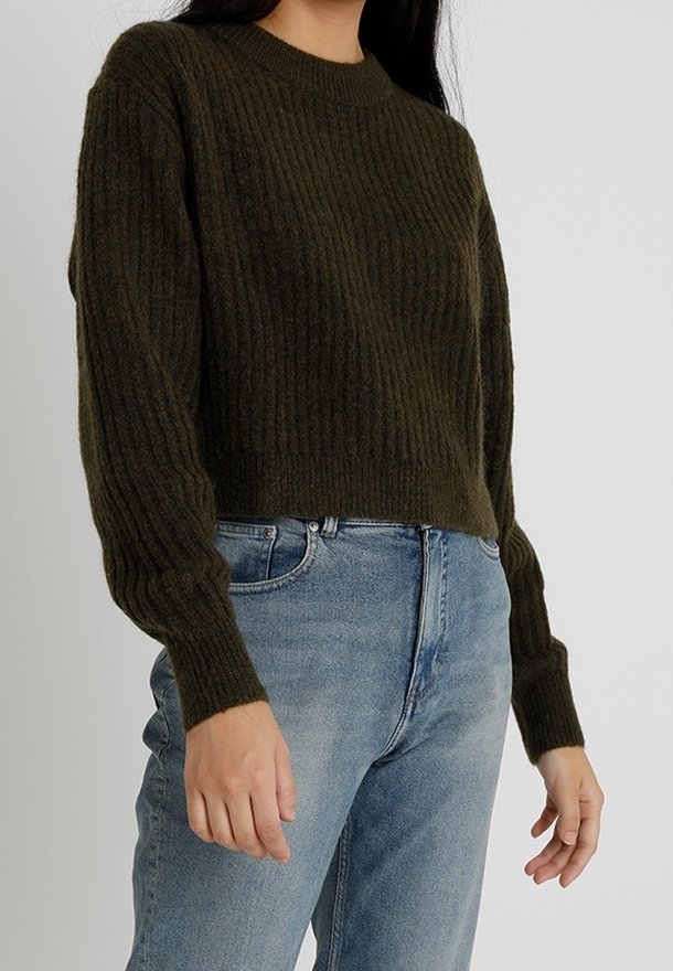 Pull en maille côtelée vert foncé avec manches longues et encolure arrondie, associé à un jean en denim bleu. Texture douce et coupe courte.