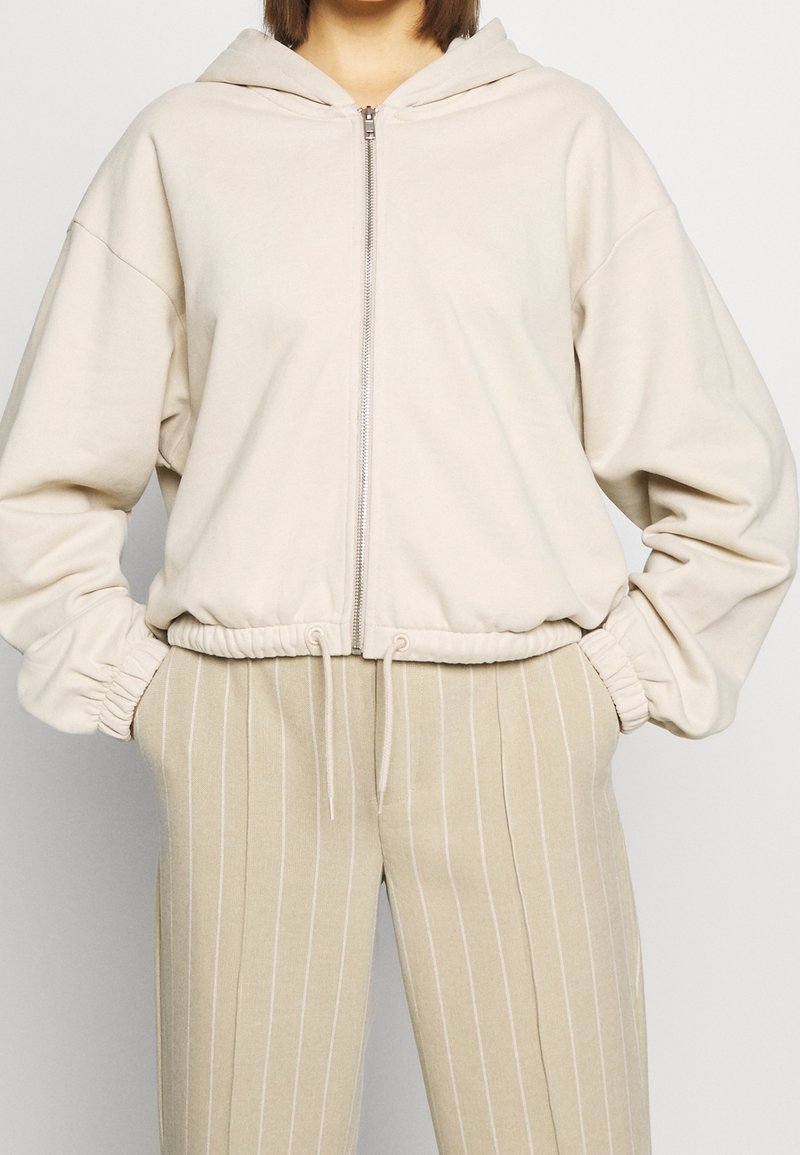 Sweat à capuche beige zippé avec poignets et taille élastiques, présentant une texture lisse et une coupe décontractée, associé à un pantalon beige à rayures.