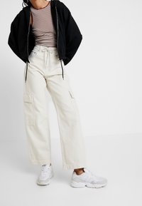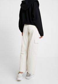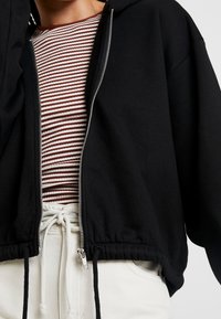 Sweat à capuche noir zippé avec ourlet élastiqué, porté avec un t-shirt rayé rouge et blanc et un pantalon blanc taille haute avec cordon de serrage.