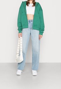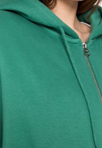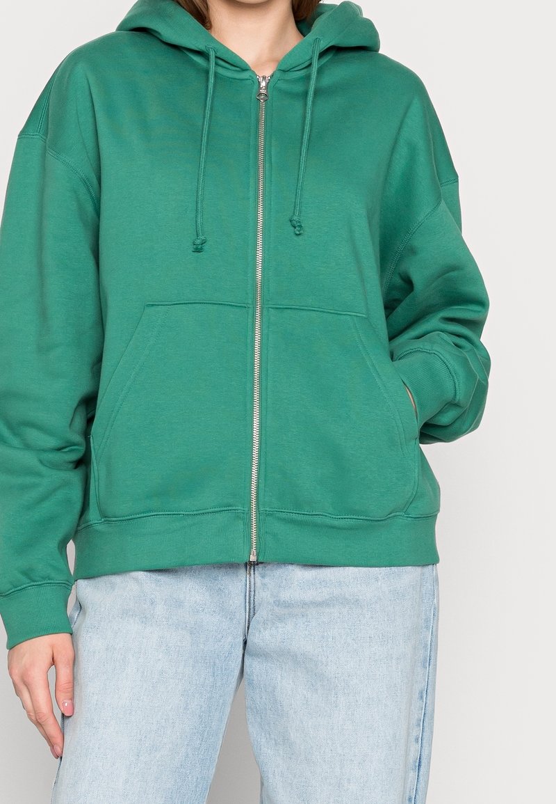 Sweat à capuche vert zippé en tissu doux, doté d'une capuche, de cordons de serrage et de poches avant. Coupe oversize avec poignets et ourlet côtelés.