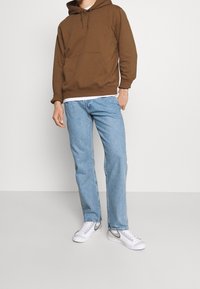 Sweat à capuche marron en tissu doux, avec manches longues, poche kangourou et capuche à cordon de serrage. Associé à un jean bleu clair.
