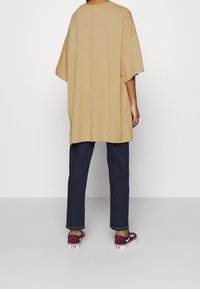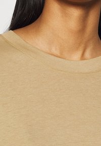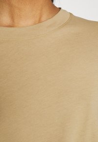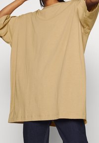 Personne portant un T-shirt beige oversized à manches courtes avec un col rond, associé à un pantalon foncé, sur un fond clair uni.