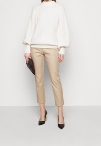 Pantalon beige sur mesure à coupe droite, longueur raccourcie et poches avant, associé à un pull blanc texturé et des talons noirs.