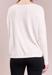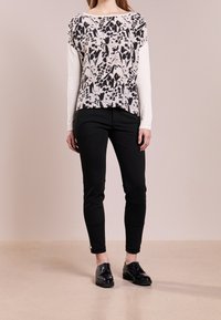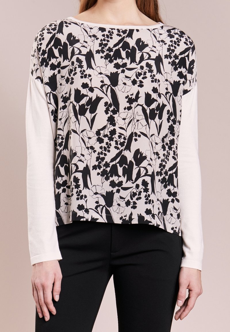 Femme portant un haut blanc à manches longues avec des motifs floraux noirs sur le devant, associé à un pantalon noir, debout devant un fond uni.