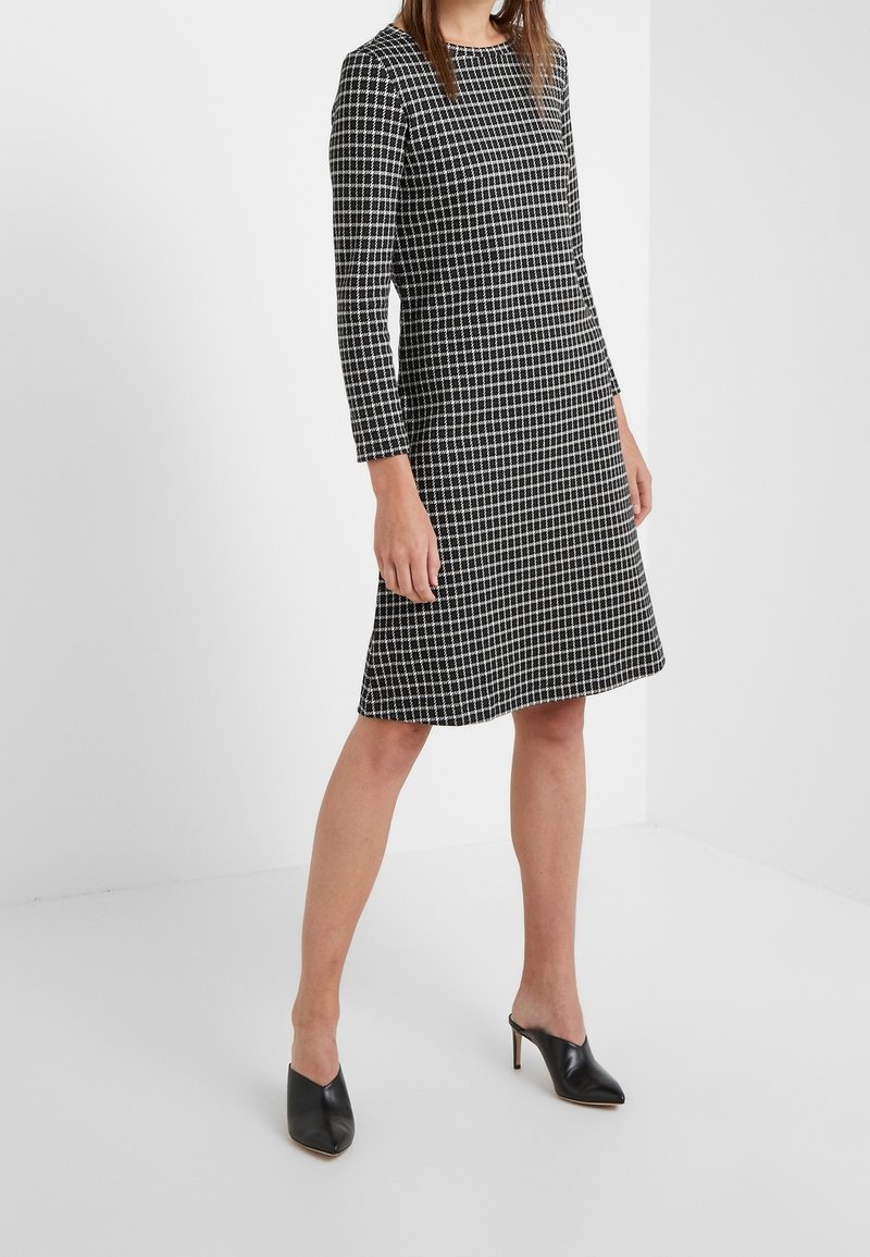 Robe à motif à carreaux noir et blanc avec manches longues, encolure ronde et ourlet évasé. Portée avec des mules noires à talons. Texture de tissu lisse.