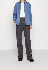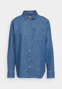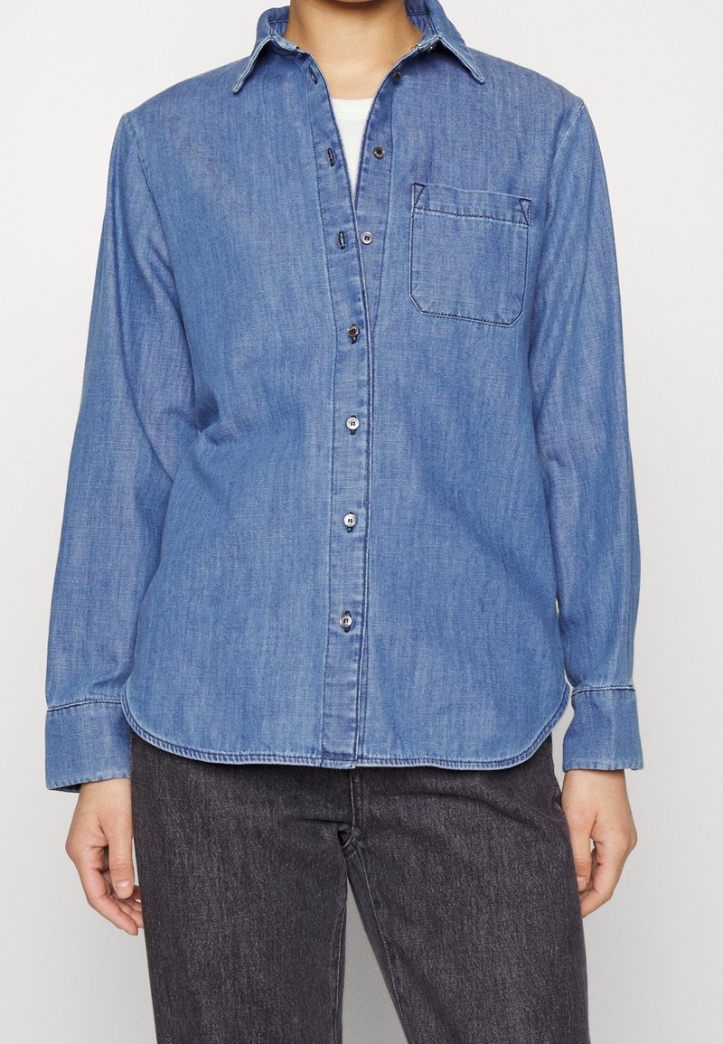 Chemise en denim bleu clair, avec un design boutonné devant, un col et une poche poitrine unique. Manches longues avec poignets boutonnés. Texture douce.