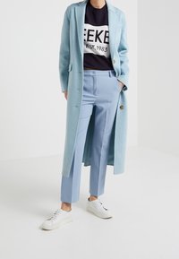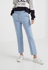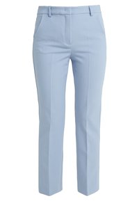 Pantalon bleu clair sur mesure avec une texture lisse, doté de poches avant plates, une coupe slim, porté avec un pull foncé et des baskets blanches.
