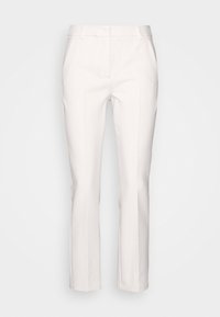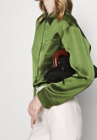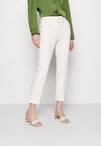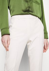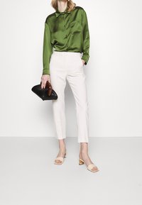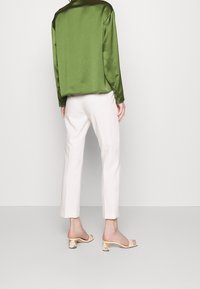 Pantalon blanc ajusté avec une coupe droite, associé à une chemise boutonnée en satin vert et des sandales à talon bloc ouvertes beiges.