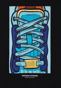 Jeune homme portant un t-shirt noir avec un graphisme de lacet de chaussure coloré et le texte « WEEKEND OFFENDER ADMIT NOTHING » sur le devant.