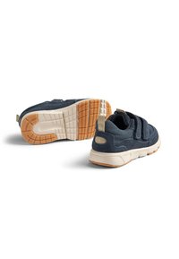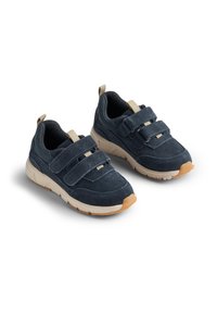 Baskets de sport bleu marine avec une tige en daim et textile, deux bandes auto-agrippantes, semelle en caoutchouc beige et accents beige contrastants sur le talon.