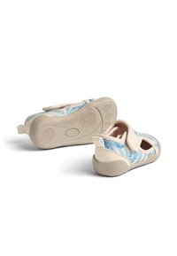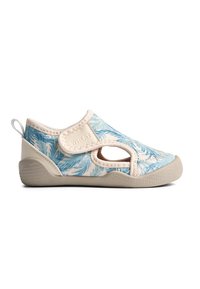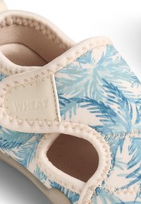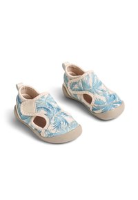 Sandale fermée pour enfant avec motif de feuilles bleues, semelle beige et sangle réglable à scratch sur le côté pour un maintien sûr.