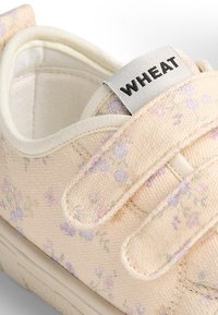 Baskets en toile beige avec motif floral violet clair, deux brides en Velcro, semelle en caoutchouc et languette à l'arrière, vues de côté.