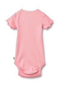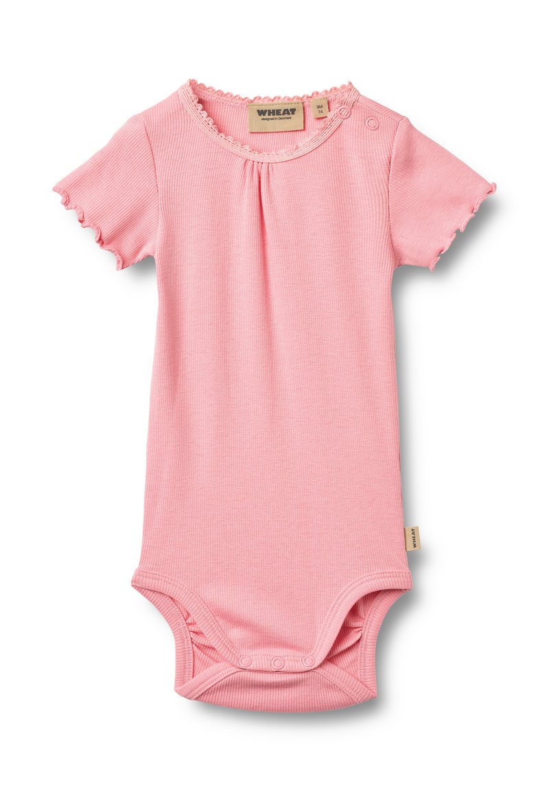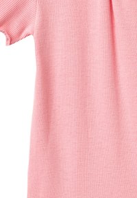 Grenouillère pour bébé rose à côtes, manches courtes, bords festonnés et fermeture à boutons à l'épaule. Pressions à l'entrejambe pour un habillage facile.