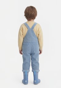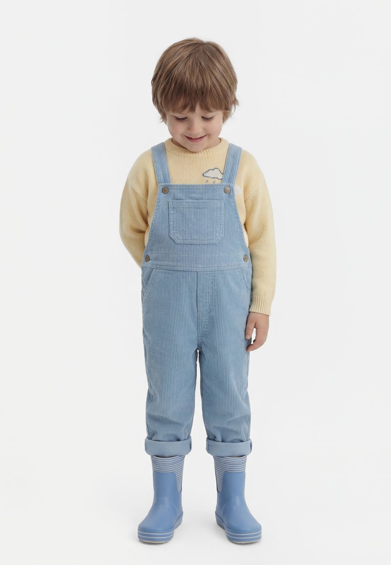 Jeune enfant portant une salopette en velours côtelé bleu clair, un pull jaune avec motif nuage, des chaussettes rayées et des bottes de pluie bleues, regardant vers le bas et souriant.