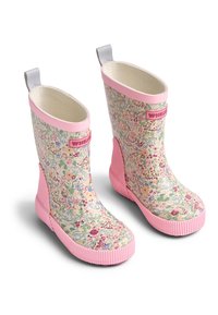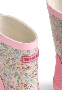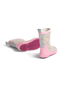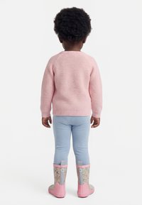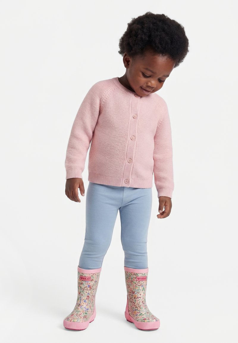 Tout-petit portant un cardigan rose tricoté, des leggings bleu clair et des bottes de pluie roses fleuries, regardant vers le bas avec un léger sourire.