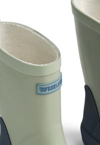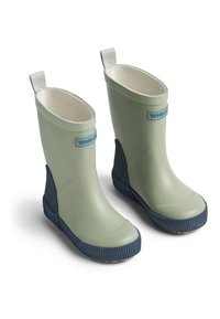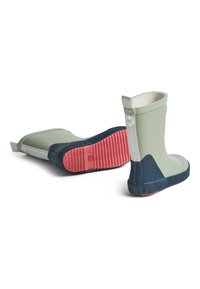 Botte de pluie en caoutchouc vert avec semelle et talon texturés bleu foncé, bande de roulement rouge et languette blanche à l'arrière.