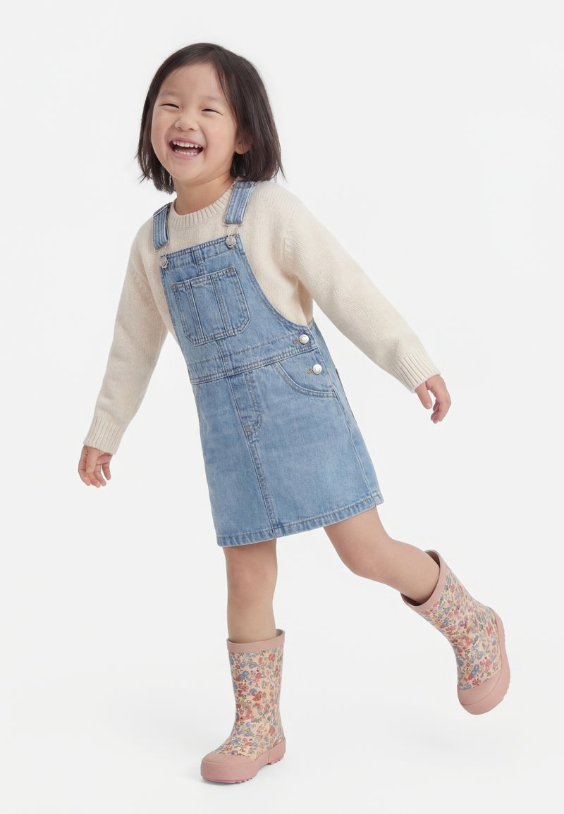 Jeune fille souriante portant un pull crème, une robe salopette en jean et des bottes de pluie fleuries, debout sur une jambe, bras tendus pour garder l'équilibre.