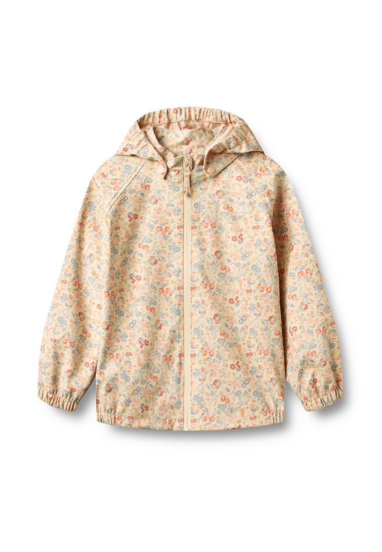 Veste beige à capuche avec petit imprimé floral rouge, bleu et orange, poignets élastiques et fermeture éclair avant sur fond blanc.