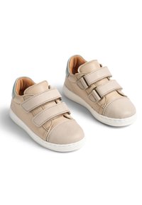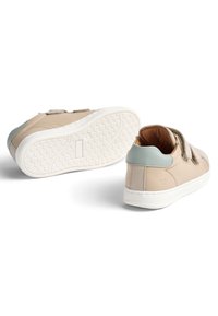 Baskets en cuir beige avec bandes Velcro, semelle en caoutchouc blanche, bout arrondi et accent bleu clair au talon. Texture lisse.