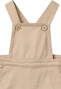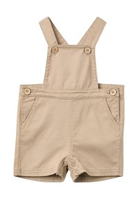 Shorts beige pour tout-petit avec bretelles croisées et une petite poche arrière ornée d'un écusson logo cousu.