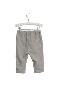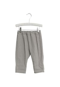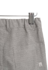 Un pantalon pour tout-petit à carreaux gris avec une taille élastiquée, suspendu sur un cintre rembourré avec des clips métalliques, sur fond blanc.