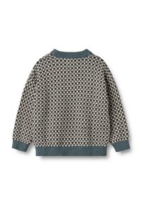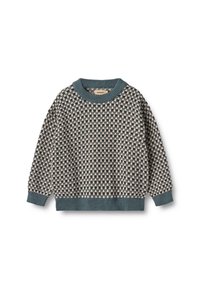 Pull en maille à manches longues pour enfants avec poignets et col bleus, présentant un petit motif à carreaux en crème, bleu et noir.
