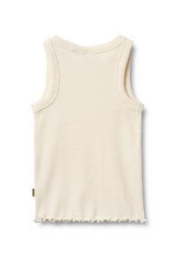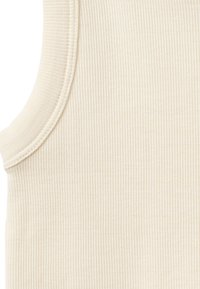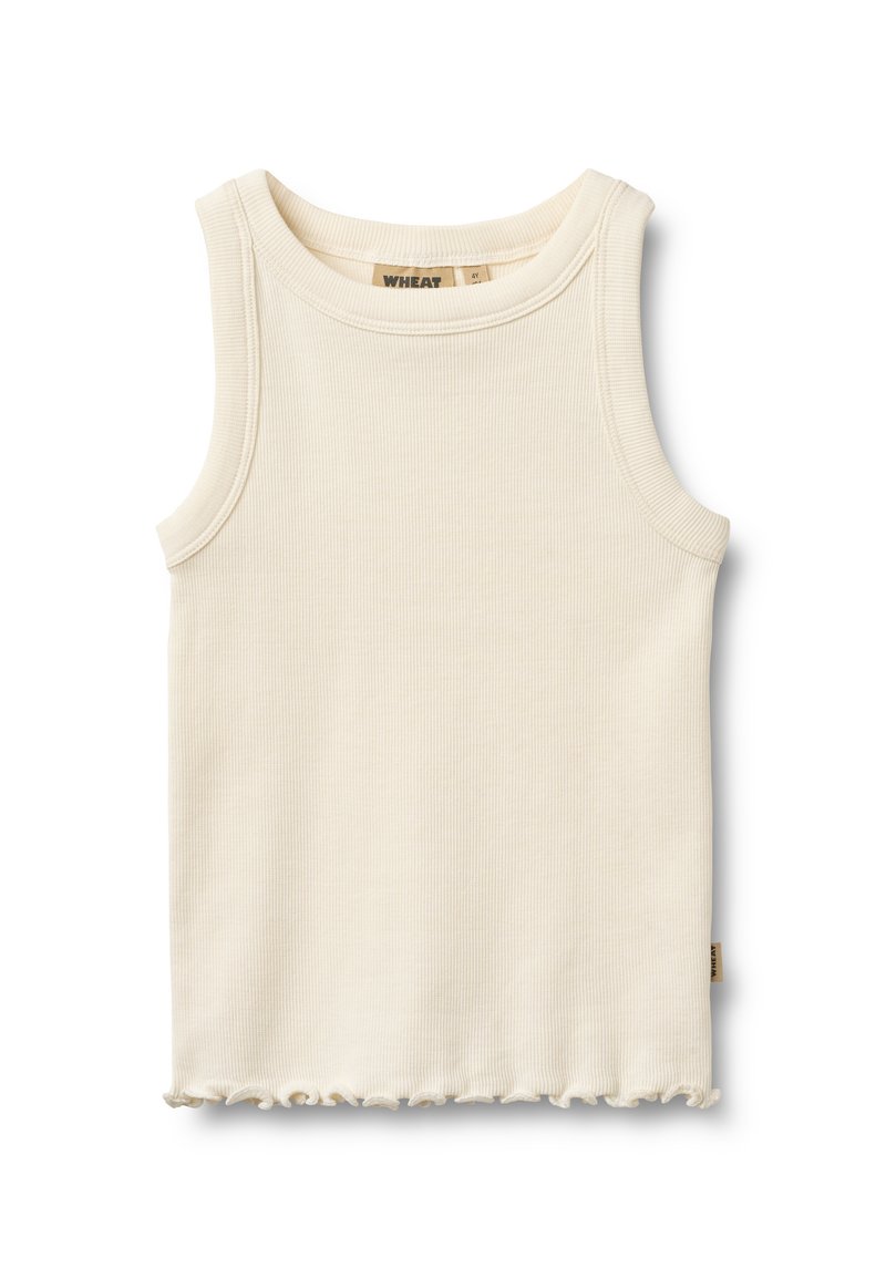 Débardeur côtelé sans manches de couleur crème avec un col arrondi et un ourlet à franges. Comprend une étiquette avec le logo de la marque. Texture du tissu douce.