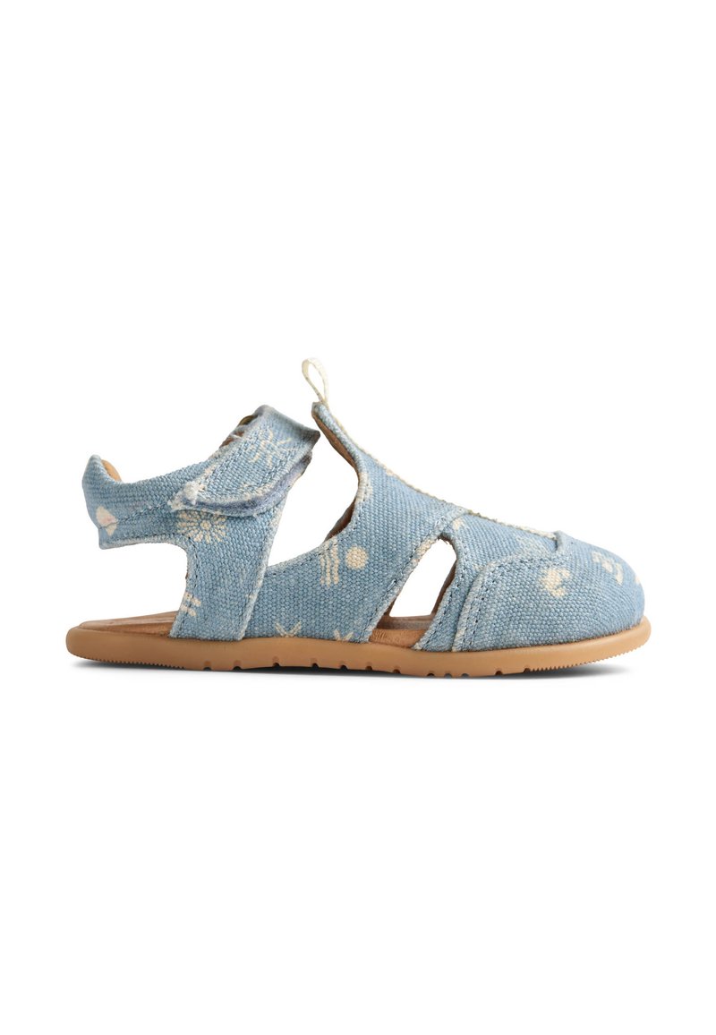 Sandale bleue pour tout-petit avec motifs floraux, bout fermé, côtés ajourés et bride à la cheville en velcro, sur une semelle en caoutchouc beige.