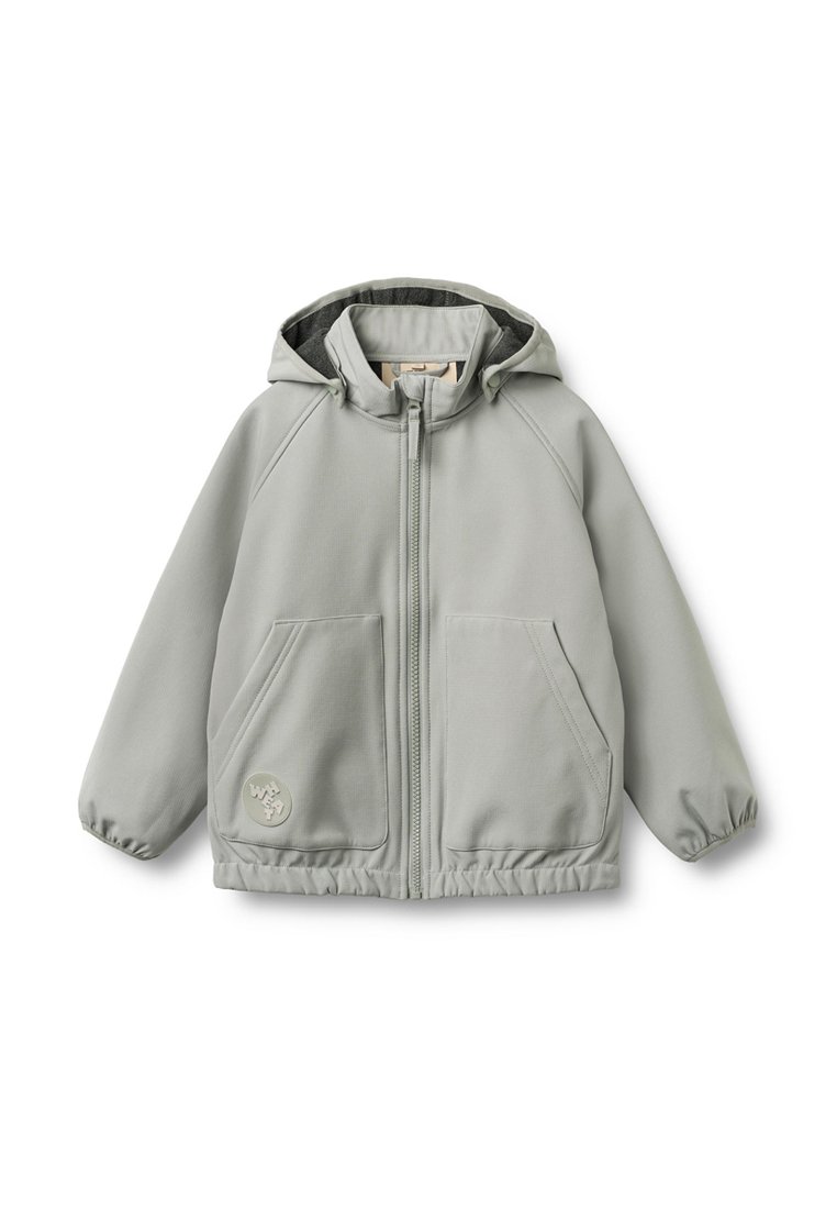 Veste à capuche gris clair avec fermeture éclair frontale, deux grandes poches avant, poignets élastiques et une petite étiquette logo sur la poche inférieure gauche.