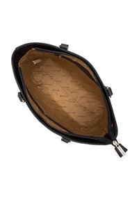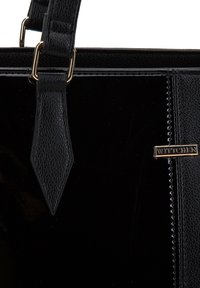 Sac fourre-tout noir présentant un mélange de textures en cuir mat et verni, un accent en motif crocodile, et deux poignées.