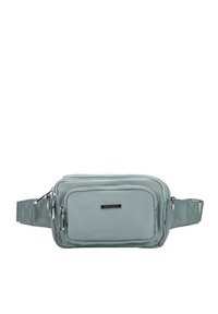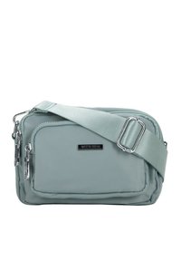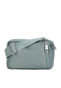 Sac bandoulière en nylon vert élégant avec deux poches zippées, une sangle réglable et des accents en métal argenté. Forme rectangulaire avec une texture douce.