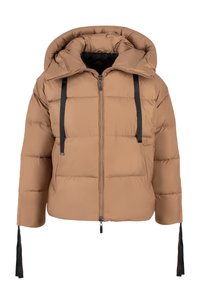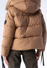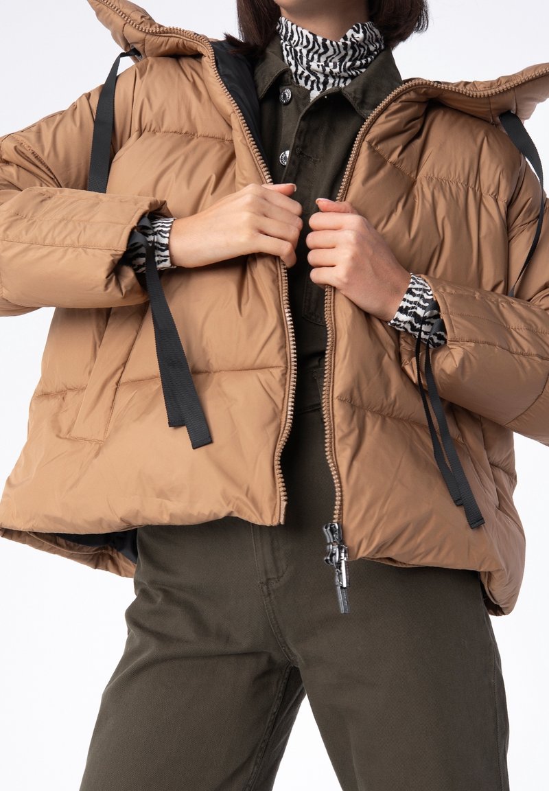 Personne portant une doudoune marron en train de la dézipper, avec un col roulé imprimé zèbre noir et blanc et un pantalon vert olive foncé visibles en dessous.