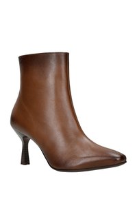 Bottine en cuir marron à bout pointu, talon haut et texture lisse. Présente un design simple avec un petit détail de marque.